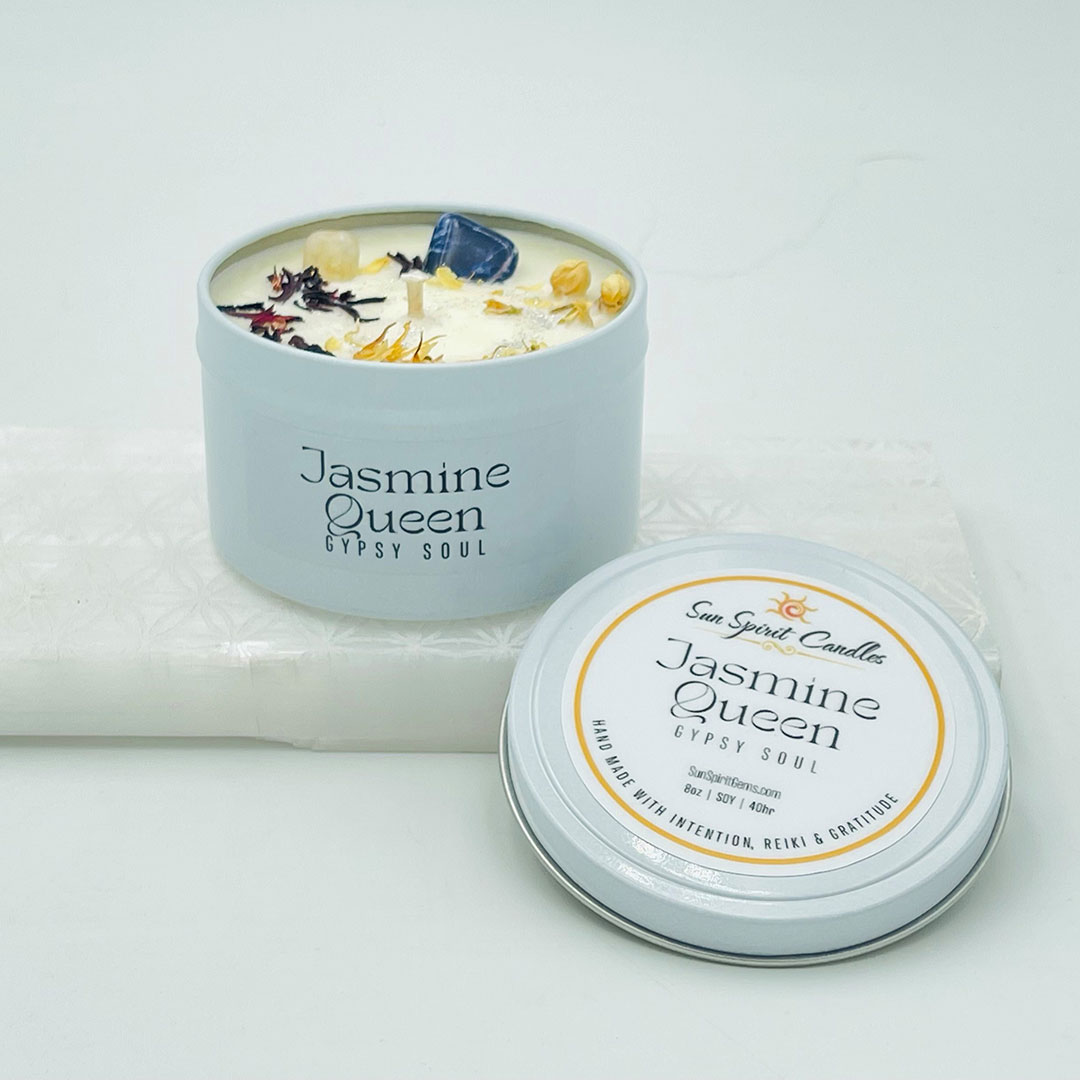 The Jasmine Queen Candle is inspired by the Greek Goddess of Love, Aphrodite. Jasmine’s heavenly aroma, along with energy-infused Rose Quartz, is intended to ignite passion and desire. Enhance your Love Rituals with heightened spiritual awareness as you burn this candle in your sacred space of love and connection with your partner.
