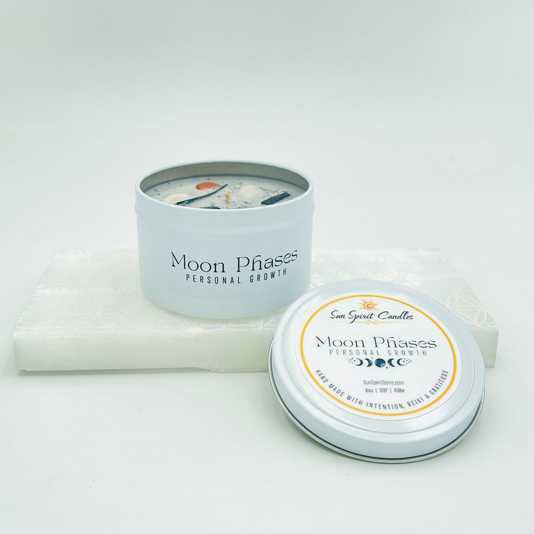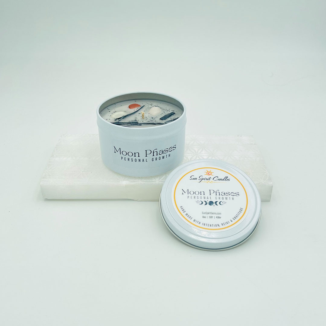 The Moon Phase candle holds the captivating energy of the Goddess in the sky, the Moon. This candle can be burnt in any Moon phase to capture its luring messages that speak to our soul. When lighting this candle, it’s a perfect time to process emotions and intentions that are for personal growth and change.