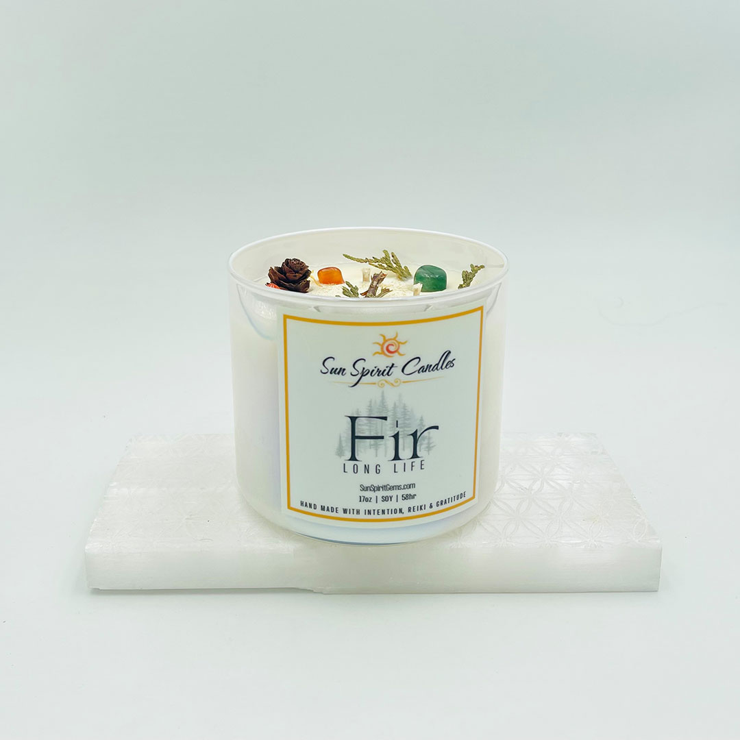 Connect with the spirit of the trees and forest energy with this invigorating our Mystic Fir intentional scented candle. Bring strength and stability into your space with the loving embrace of mother nature’s majestic beauty and life-giving elements. When you light this candle, may you feel grounded yet lifted to a higher vibration that can be found on a beautiful mountain top.