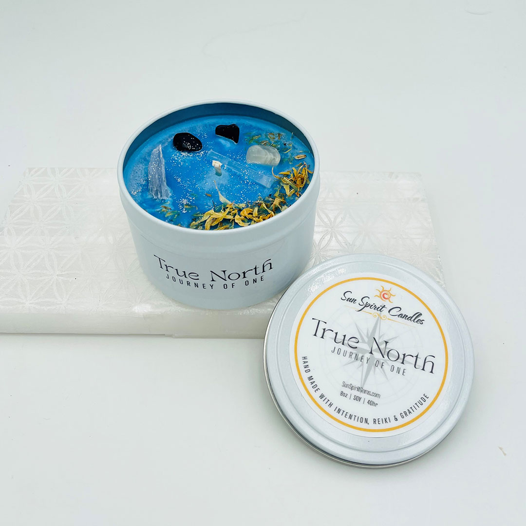 The essential oils in our True North scented candle are a blend designed to enhance your mystical and intuitive abilities. A sacred blend includes Dark Musk, Coral, Vetiver, Amber, and Sweet Orange to delight your senses.
